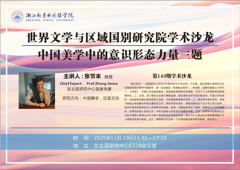 世界文学与区域国别研究院第143期学术沙龙 主讲人: 张节末 教授 主讲人简介:东北亚研究中心首席专家 研究方向:中国美学,泛亚文化 讲座题目:中国美学中的意识形态力量三题 沙龙简介:“意识形态”,是我最近几年在古代美学研讨中关注的一个主题。我们若是从制度史与文化模型的面向思考中国美学,就一定会触及“审美意识形态”。举诗歌、造像和青瓷三个例子,一,《诗经》,它是礼乐制度的配伍,有角色扮演的程式化歌舞,而非个人之抒情或劳动的审美转化。二,云冈、龙门等巨大石窟之佛教造像,是在皇权主导下的宗教活动,所谓北齐的微笑,也是俊美的高氏皇族面相之投射,它们都是审美意识形态。三,著名的宋瓷天青色,青瓷乃是越过青铜器向早期玉器回归之色,具有天的权威性,颇有点类似时下流行色之官方发布,绝非天青色等烟雨的诗人罗曼蒂克的想象。其他,中国园林传达了皇家、官僚和文人的审美趣味,却得到全国人民的认同,不免也是意识形态庞大能量的渗透。又如,如果考虑到敦煌五台山巨大壁画以青绿山水作为整个画面的组织构形的主导,那么为什么黑白的水墨就是落魄之文人骚客的孤情只绪呢。总之,审美意识形态是一个非常重要的美学思考角度,有待深入。 时间:2025年 11月 19日15:40~17:10 地点:东北亚研究中心E228会议室 |